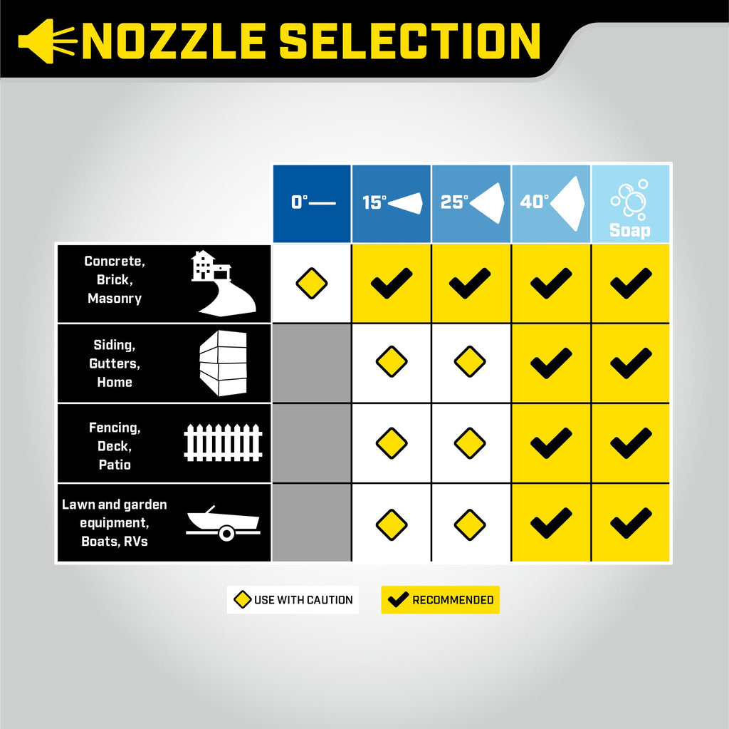 Der 3200 PSI-Hochdruckreiniger wird mit fünf Schnellanschlussdüsen für eine Vielzahl von Anwendungen geliefert: 0°, 15°, 25°, 40°, Seife.